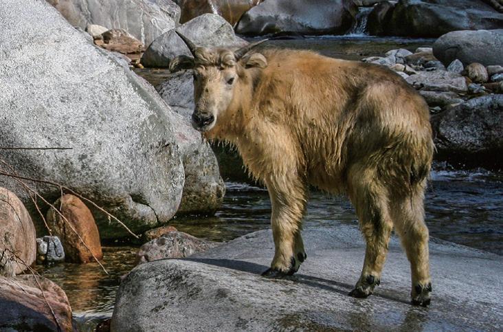 2003年初夏,我们竹类研究课题组启动了“秦岭大熊猫主食竹类研究”项目活动。7月的一天,早饭后我提前出发,刚爬到鲁班寨顶,就发现西侧鞍部和坡面有几群羚牛边吃边向平缓的鞍部集中。我蹲在一个距离羚牛群近20米有半人深的石缝里注视着它们的一举一动,不时地按动快门。只见它们一会吃草,一会顶牛,一会亲昵……一个多小时,精彩场面无数,很快相机没粮食了——5个胶卷已经用完了。