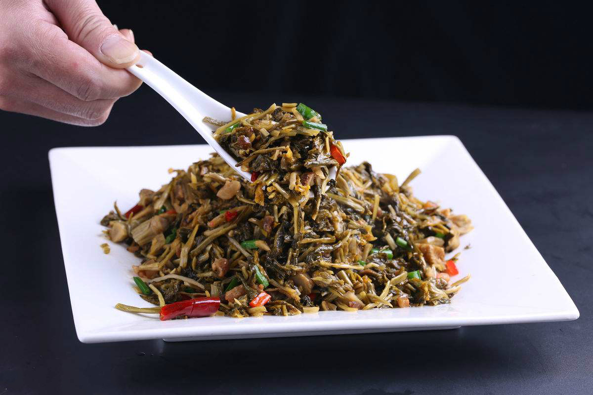 腌菜干是我读初中寄宿学校时候经常吃的。我祖父常给我说,吃过三瓮腌菜干,方能读得圣贤书。我确实是吃了许多腌菜,家里物质不宽裕,母亲每次给我炒一大罐的腌菜,能吃上一周。炒的腌菜很简单,只加点茶油和辣子,有时母亲加两块肥肉在里面炒,似乎更香了。家乡有一味菜,叫腌菜猪肉,我很爱吃。热天的时候,肉容易坏,家里买了点肉,肥肉居多,又舍不得一餐吃完,于是和着腌菜一起蒸烂,肉的味道又酸又香,不腻很下饭,肉保存的时间也长,腌菜入了荤油,也变得更有味了。
