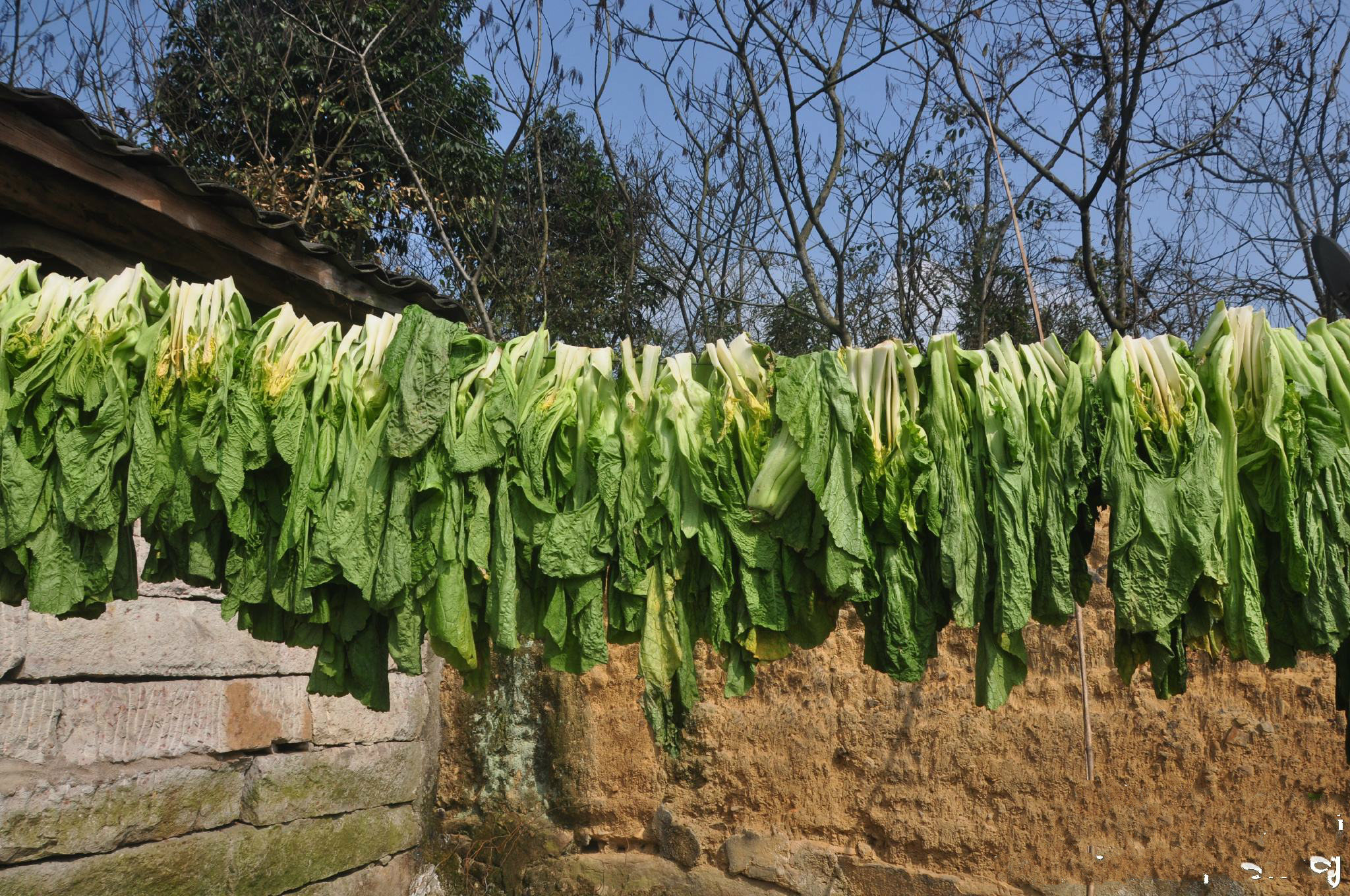 酸菜出了缸,挑到晒坪上的竹席上晒干,晒到七成干的酸菜头,水分少了,更脆,风味更好。我曾经一口气吃过七八个这样的酸菜头,酸菜头是越吃越饿,吃了还想吃,不过吃多了容易害肚子疼,都不敢多吃。晒干的腌酸菜变成了灰黑色,收进瓮里,可藏一两年不坏。有的地方叫梅干菜的,但味道不酸,和重庆外婆家做的一样,想必不经过泡制直接腌制的。