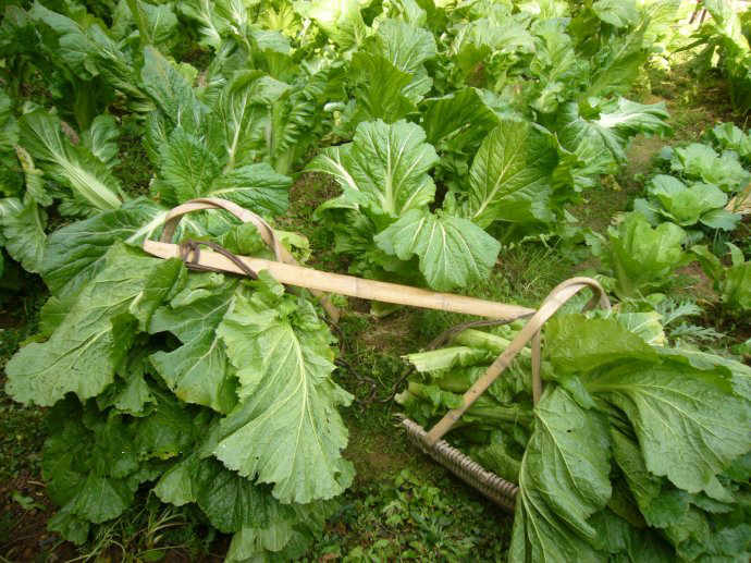 用来腌酸菜的葑菜叶先洗干净了,挂到长竹篙上晒蔫了。晒蔫的菜叶在一个大簸箕里用菜刀切好,切的时候叶柄大的那头,保留四五寸长,不切碎,做腌菜头,剩下的都切碎。切好后,母亲把我们几个孩子的脚洗干净,让我们在簸箕里来回地踩,我们蹦来跳去,快乐极了。母亲说,慢点慢点,簸箕都要给你们踩烂。等到母亲说已经踩烂了,不用踩了,我们还不觉得累,意犹未尽的样子。踩好的葑菜叶一层菜一层盐码进腌菜缸里,码实了注满清水,最后压上几块光滑的大河石,就可以了。葑菜种得多的人家能腌上四五缸,一般人家都会腌上两大缸。