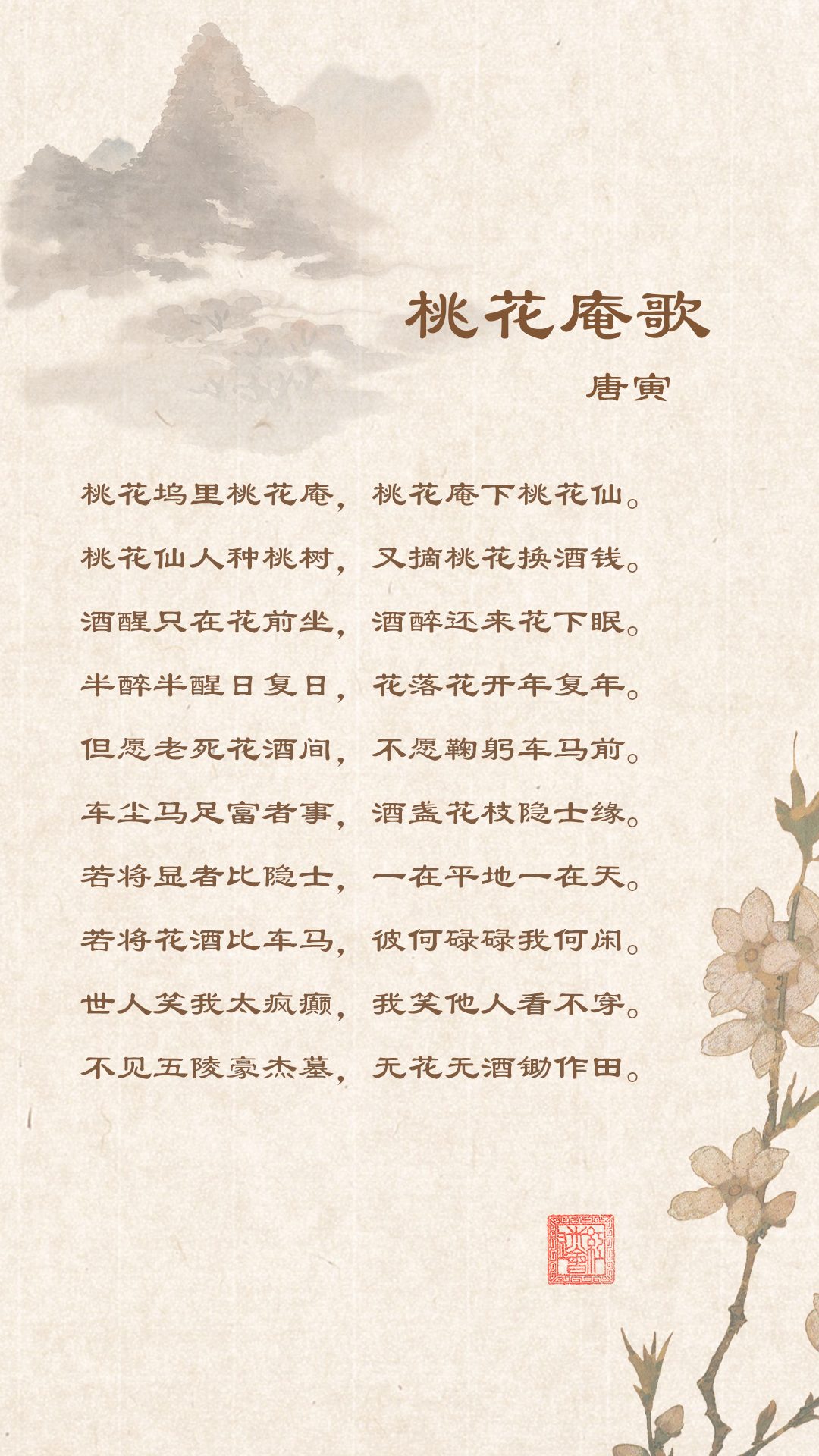 桃花坞里桃花庵,桃花庵里桃花仙。桃花仙人种桃树,又摘桃花换酒钱。
