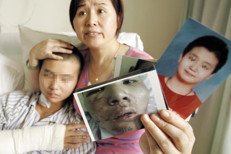事情发生在4月26日。不到2个月之前的3月1日,小志被父亲哄骗着从贵州送到重庆。交纳近2万元的学费后,他和父母之间的直接联系被立刻切断,这个在入学协议中写得清清楚楚,“学员入学3个月内不得与家长通话或者探视”,只能写信。3个月是目前的行走教育行当里按照徐向洋的模式,通用的“亲情隔离”时限。小志的极端行为,终于将这时限提前了1个月。他见到了父母,也不必再担心被送回学校,代价是“食道灼伤、上唇摔裂缝合23针、下唇缝合9针、右手桡侧骨折”以及身上若干处来历不明的旧伤。这些都是2个月训练期的记忆。让母亲冯秋菊心疼的还有“送去时候白白胖胖,170多斤,不到2个月就瘦了30多斤”。