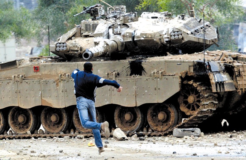 ( 2003年10月6日,巴勒斯坦青年愤怒地用石块砸向以军坦克 )