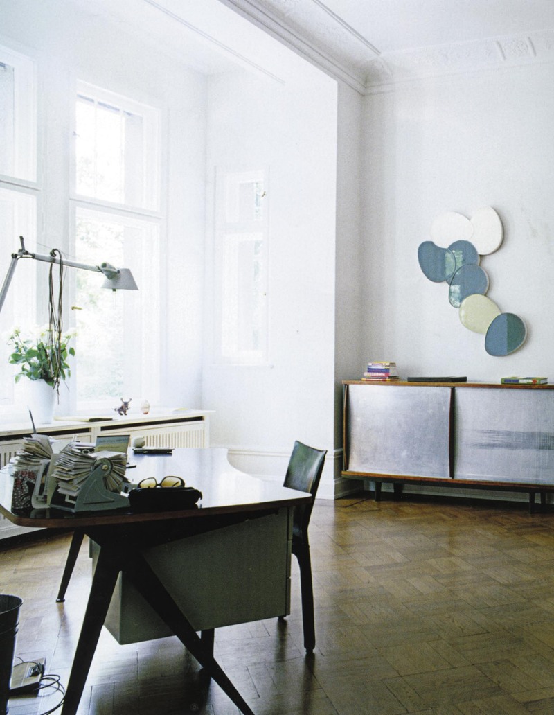 夏洛滕堡当地居民在家居审美上一直保留着贴花壁纸、把天花板刷成深色的传统,在意大利接受过艺术和设计教育的卡瑞娜很不以为然,毫不留情地将这一套撇之一边。她保留了原来的旧木地板,将几个房间的天花板全部刷得雪白,上面用灰泥塑出华丽的图案,于是,不仅天花板,整个房间都摩登起来了。阳光照进来,天花板延伸得似乎没有了边际,映衬得屋里的家具极为矮小,尽管它们中不乏大个儿的东西。卡瑞娜说:“白色的色调很适合我,因为我在工作时需要很好的光线,这样不需要凑得太近我也能看清楚各种颜色。”天花板也反映出主人对于“物”的态度:一切物质为我所用,绝不会因为它是天才设计师的产品,就要迁就它成为居室中的主角——卡瑞娜的家具中可是有丹麦大师汉斯·威格(Hans Wegner)和法国家具设计师让·普鲁威(Jean Prouve)的作品。