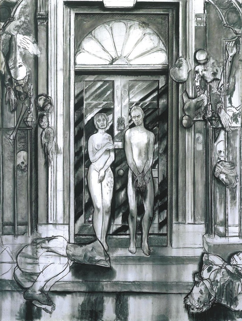 6月11日,在伦敦举办的英国皇家艺术学院夏季年度展上出现了一幅讽刺插图。该插图为英国一名反对伊战的艺术家所作。插图中布莱尔夫妇被描绘成被驱逐出伊甸园的亚当和夏娃——两人赤身裸体地被驱逐出唐宁街10号。 )