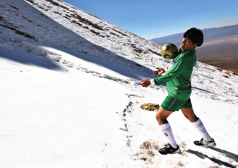 6月12日,玻利维亚总统莫拉莱斯在位于该国西部、海拔6000多米的一座死火山上进行足球比赛,以此举来抗议国际足联禁止在高海拔地区进行国际比赛的决定。 )