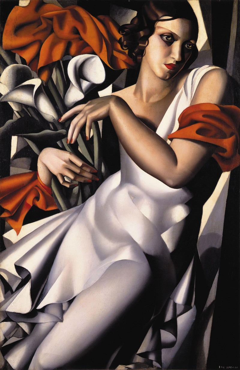在巴黎,塔玛拉没日没夜地学习绘画。那时已经接近了神话般的1925~1935时期,美国人给这段时期一个专门的名字叫做“Roaring Twenties”,“兴旺的20年代”;巴黎人也给了它一个名字:“Les annnes de follies”,“疯狂年代”。塔玛拉为自己选定的老师是立体派大师让·洛特(Jean Lhote)和纳比派象征主义画家莫里斯·德尼(Maurice Denis),从前者她领悟了构图的无限可能,而后者教给她的是色彩的华美光感和画面组合能力。从小被奢华生活熏出来的品位和对于艺术时尚的敏感帮助了她,塔玛拉对于如何用才华征服上流社会有过人的直觉,所以不用浪费时间,也绝不多走一步弯路,以令人惊异的速度迅速成名。装饰艺术派(Art Decoratif)的华丽和奢靡正合了那个时代的气质,一度成为设计、建筑、服装和绘画领域的主流。塔玛拉顺势加入进去,不过对自己的师承稍做调整,就毫不费力站上了顶尖。她的女儿后来为母亲写过一本传记,书里有这么一段:“她只画他们,那些富豪,精英,名流——总之都是人上人。和里面的大多数人,她也上床。”玛塔拉从来不遮掩自己赤裸的做人信条:艺术和上流社会同样重要。对于她,这两样东西互为工具,帮助她轻松打开两扇在别人眼里看似紧闭的大门。塔玛拉带有浓厚装饰风格的肖像画在上层社会那个圈子里流传开,抢着为她画作写评论的男人女人多得是。她流亡在巴黎,但这完全不妨碍她比从前更有名、有钱并且美艳惊心。