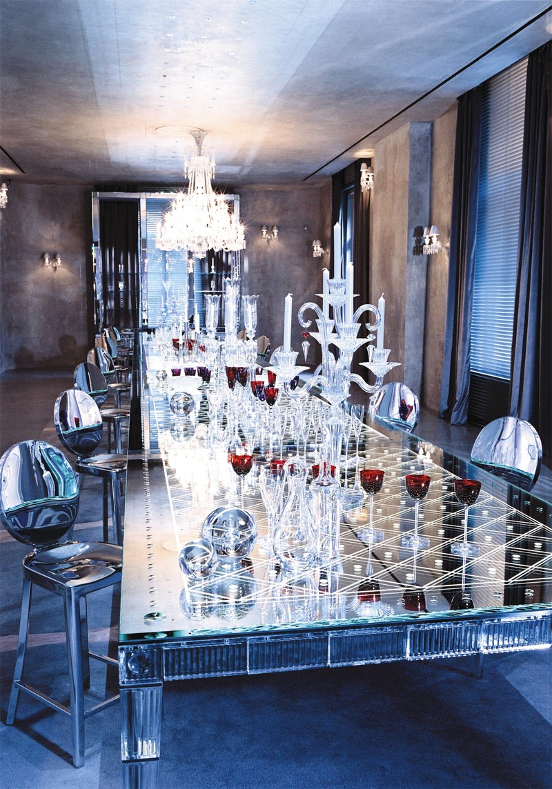 对于Baccarat这家有着超过240年历史的法国水晶制造商来说,创造的激情大概首先是一种法国式奢靡想象力的产物。幽暗的展厅里摆放着一张10多米长的餐桌,两端悬挂着法国历史上那对著名夫妻拿破仑和约瑟芬的画像,摆满了水晶餐具的桌子仿佛象征尘世欢乐的祭坛。在这里,一些可以称得上“世纪古董”的庞然大物还包括1891年的总共88盏水晶烛台的“Grand Marly”枝形吊灯、为沙皇尼古拉二世制造的“沙皇”枝形大烛台或者总重量超过679公斤的“餐桌和船形容器”——1900年在巴黎世界博览会上展出的这件作品是由水晶船和镀金青铜框架的水晶餐桌组成,一个小孩站在象征着巴黎市的船头眺望地平线,另一个小孩解开船只的缆绳准备奔向20世纪。