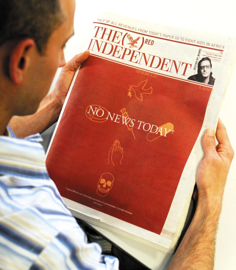 ( 为唤起公众对非洲艾滋病疫情的关注,著名歌手波诺5月16日客串了一次英国《独立报》的编辑。在当天出版的报纸上,以英国艺术家达米恩·赫斯特作品为背景的头版仅有两句话:“今日无新闻——只是有6500名非洲人,死于一种可预防、可治疗的疾病(HIV/AIDS)。”在这一期报纸中,波诺采访了英国首相布莱尔和财政大臣布朗,美国国务卿赖斯也应邀开列了自己最喜欢的10首乐曲。当天报纸收入的一半,将被捐出,用于非洲防治艾滋病事业。■ )
