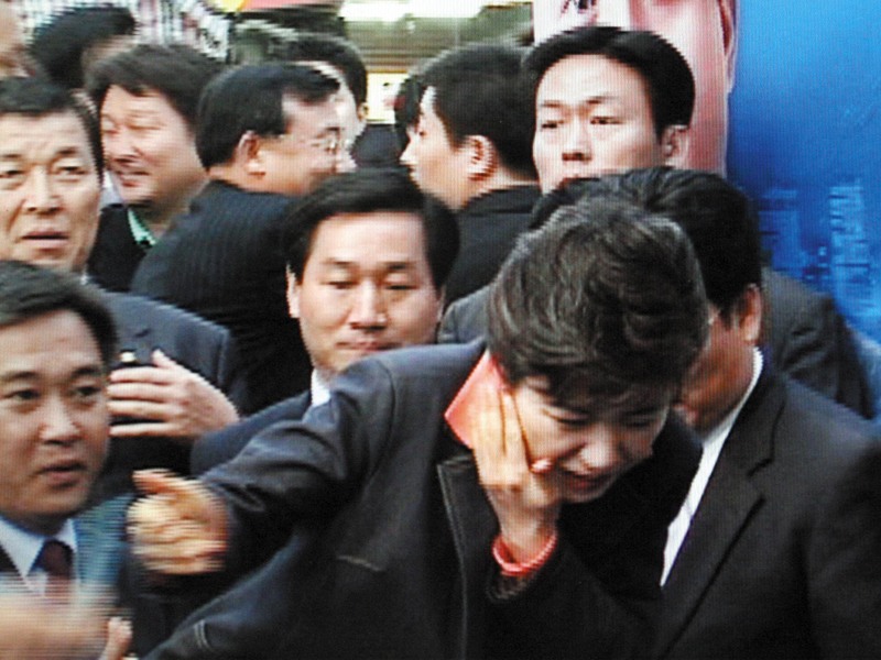 ( 5月20日,韩国最大在野党大国家党代表朴槿惠在首尔遭到身份不明的歹徒袭击,右脸被文具刀割伤,送到医院后被缝合了17针。今年54岁的朴槿惠是韩国前总统朴正熙的女儿,2004年在大国家党选举中,她曾经顺利击败其他候选人,成为韩国39年来第一位女党魁。她被认为是下届韩国总统大选的有力候选人之一。朴槿惠的母亲陆英休和父亲分别在1974年和1979年遇刺身亡。■ )