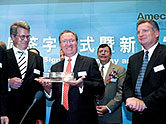 ( 北京飞机维修公司总经理兼CEO贺利(左一)和美联航董事长CEO谭凯翔(左三)在签字仪式上 )