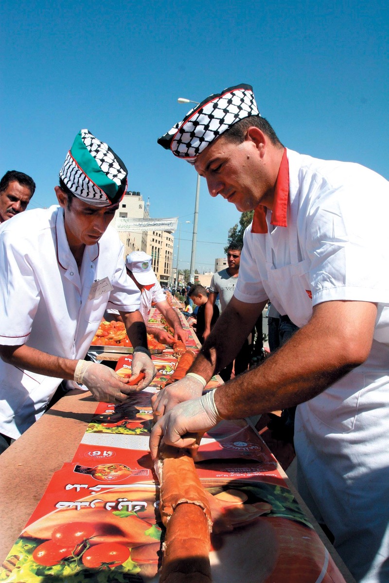 位于约旦河西岸的巴勒斯坦城市杰宁一向只和绑架、冲突、激战之类字眼相连,但在8月10日,它几乎成为一项新的吉尼斯世界纪录的诞生地。在上百名志愿者的帮助下,两名厨师试图用180公斤熏肉、350公斤西红柿和250公斤青椒制成一根750米长的三明治。如果成功,它将打破2004年在葡萄牙创造的634米长三明治的原有纪录。可惜的是,卫生部门在最后一刻以三明治可能变质为由中途制止了该项挑战。■ )