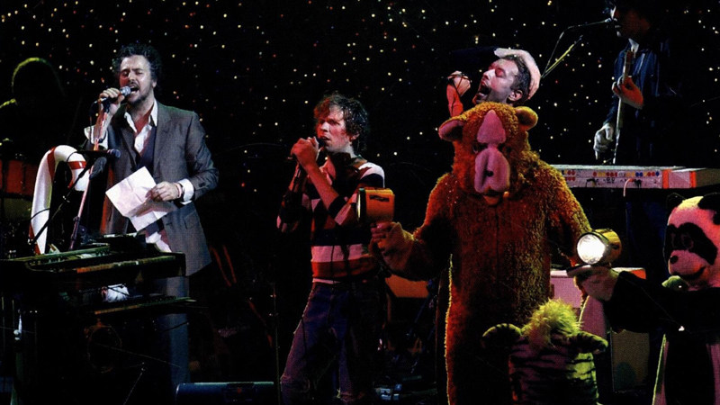 晚8点,歌剧院内的灯准时灭了,大幕徐徐拉开,3个身上裹着假动物皮毛的男人出现在聚光灯下。一个中年男人走上舞台,他一边把五颜六色的气球抛向观众,一边用手里拿着的喷雾器向四面八方扫射,使整个舞台笼罩在浓重的烟雾里。舞台上还有4个转动着的舞厅专用反光球,把一束束白光透过烟雾打向场内。舞台两侧又各有八九个身穿各式动物皮毛的人拿着手电筒冲台下乱晃,他们都是演出前临时从观众席上找来的志愿者。就在观众们疯狂欢呼声中,3人操起各自的家伙,喇叭里传来的巨大声响立刻如一面墙一样压向观众席。舞台后的一块巨大投影幕上出现了影像,那分明是一部搞笑的日本校园恐怖片中的镜头。