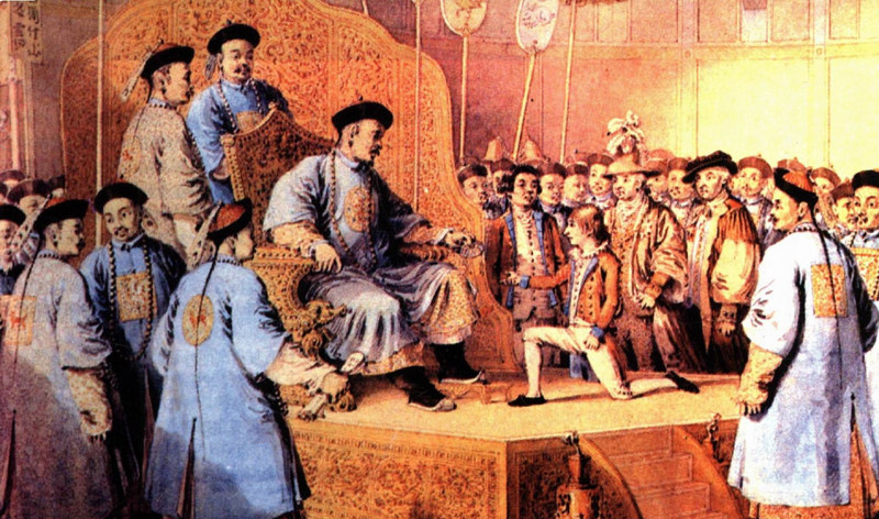 1793年英国派出以马戛尔尼为首的大使团在热河行宫觐见乾隆皇帝。图为英使马戛尔尼和他的侍童都是单膝下跪呈送国书和接受皇帝赏赐