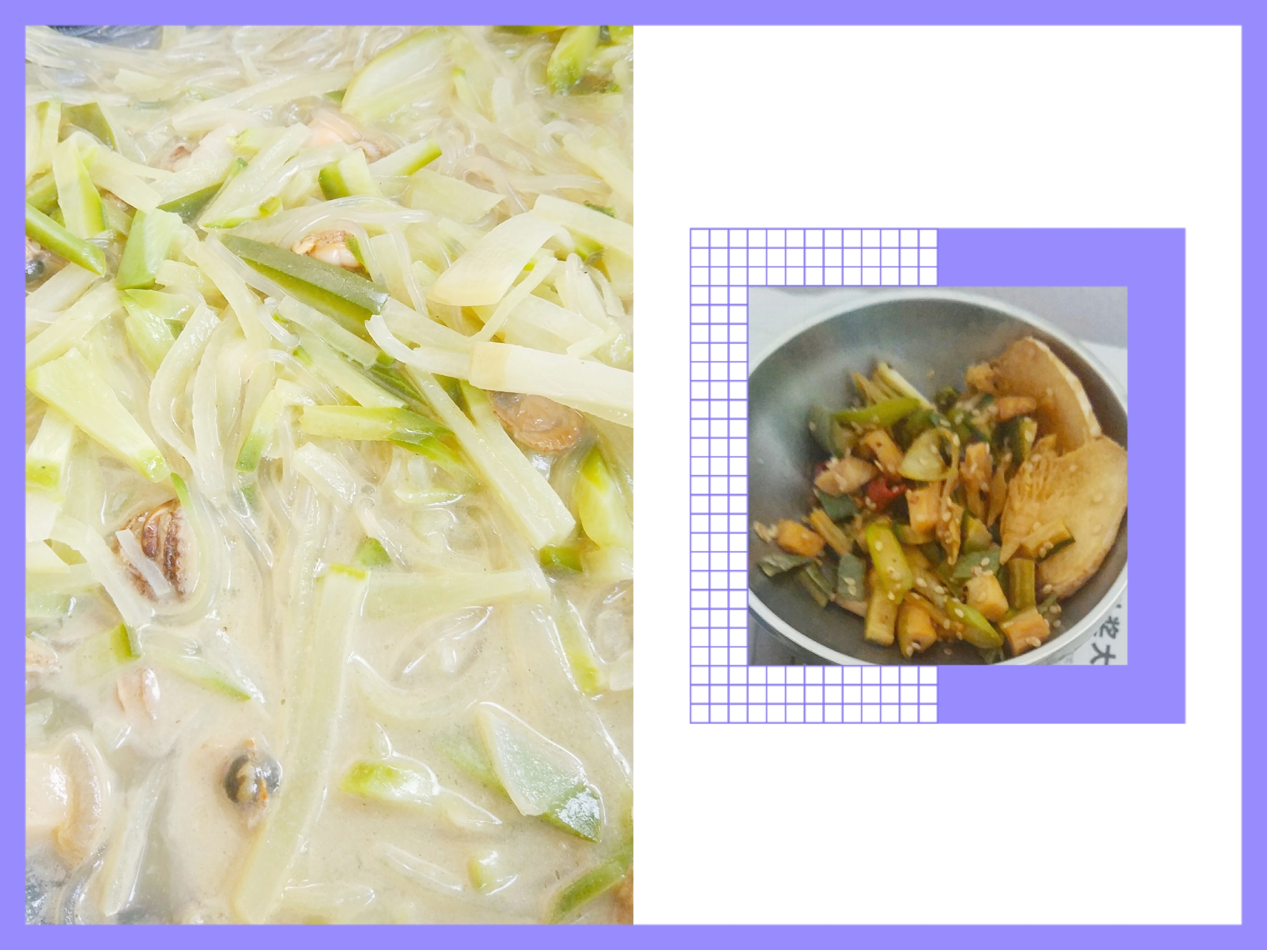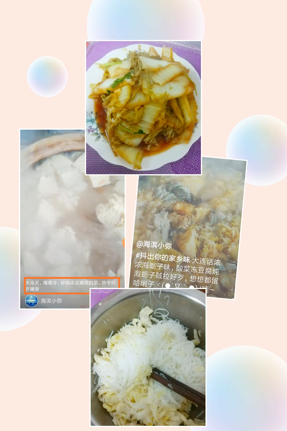 第一部分白菜篇,一说到白菜第一时间就想起东北冬天的特色菜——酸菜。前几天看抖音偶然划到一个短视频,调侃说要给东北积酸菜申请物质文化遗产呢!虽说是戏言,但从这也可看出东北人对于酸菜的稀罕。属于东北的大连人当然对于酸菜也是毫无例外地稀罕歹(吃的意思)。我妈每年都会亲自积一些酸菜,待到寒冬腊月,酸菜新鲜出坛,与肥肉相间五花肉及代表大连话的特色海鲜海蛎子一起来炖,还没吃先闻到那酸香鲜流的味儿就不禁口水直流了,在寒冷的冬天趁热来一口这混着肉香和海鲜的酸菜,那恰到好处的酸爽真是绝了!冬天新鲜的白菜也是好吃,和冻豆腐与五花肉粉条及海虾放在砂锅里一起炖,夹一筷子软烂入味的白菜和吸满汤汁的冻豆腐再来一口热汤,不一会儿从里到外都暖和了,这真是冬天暖身暖胃的首选。昨晚我亲手做了一盘极其简单却是我的最爱,那就是醋溜白菜,仅需蒜头爆锅,加入酱油与白醋或米醋翻炒软烂即可,在出锅前再加入一把香菜味道更佳,别看简单却酸甜可口,很是下饭。最后介绍一道凉菜,把白菜芯切丝与粉丝或炸地瓜丝放入白醋蒜泥和盐搅拌均匀就OK了,这道凉菜口感清爽解腻乃我家年夜菜的常客。