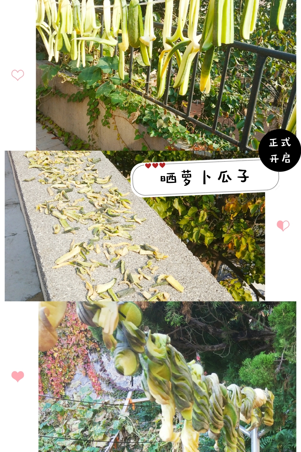 第二部分萝卜篇,这里的萝卜乃绿萝卜也,萝卜号称“小人参”有益气滋补之功效,更何况老话说得好“药补不如食补”,因此冬天吃萝卜既美味又健康。在大连街冬天吃萝卜最经典最有特色的吃法就是晒成“萝卜瓜子”来吃,现在正是晒“萝卜瓜子”起始阶段,过一段时间就会满大街都是切至成各种形状的腌渍后的萝卜在经受大风与阳光的洗礼后,待到晒掉大部分的水分,那时萝卜就蜕变成为“萝卜瓜子”了,便于长期储存,想吃的时候只需提前用清水泡制洗净,可以放入酱油芝麻和香油当咸菜吃,清脆入味与小米粥搭配,乃冬天早餐之绝配。也可与咸鱼或肥肉一起蒸着吃,软乎有味,堪称大连冬天蔬菜与海鲜完美融合经典菜式。当然了萝卜也可以擦成丝与扇贝丁或海虾做成汤来享用,那滋味怎一个“鲜”字了得!