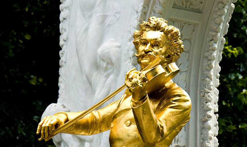 提到“圆舞曲”,我们会想到一个名字:约翰·施特劳斯(Johann Strauss,1825~1899),他被誉为“圆舞曲之王”。约翰·施特劳斯写的是维也纳式的圆舞曲,例如《蓝色多瑙河》等,那些是乐队演奏的,而施特劳斯本人也是指挥家与小提琴家,我们在维也纳可以看到最著名的施特劳斯的雕像就是一个金色的正在拉小提琴的雕像。肖邦的圆舞曲与维也纳的圆舞曲又不大一样,一个很大的区别在于施特劳斯的圆舞曲就像是在给跳交谊舞伴奏一样,让人不由自主地想跳舞,与舞蹈非常的契合;但肖邦钢琴曲的创作有一个特点,即有很多都取材于舞曲,例如圆舞曲、波罗乃兹舞曲、马祖卡舞曲等,都是取材于各种舞蹈,但他都是把这些舞蹈音乐升华为独立的器乐音乐,因此它不是那么像是给舞蹈伴奏的音乐,这是肖邦圆舞曲与施特劳斯维也纳圆舞曲的一个不同。当然还有一个不同在于,肖邦是给钢琴写的,而施特劳斯是给乐队写的。