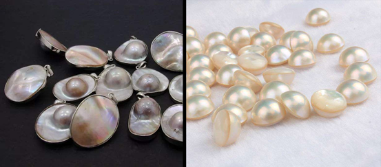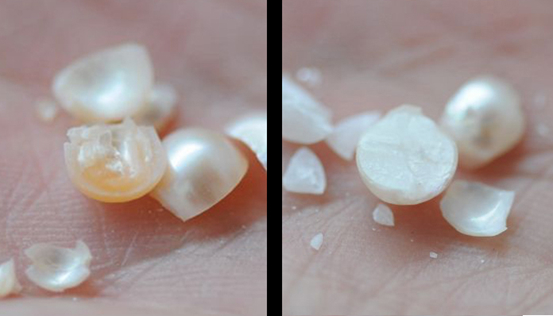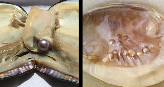 ▲ 淡水养殖无核(左)与有核(右)珍珠