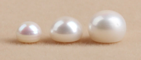 馒头珠和马白珠都属于一面隆起一面较平的珍珠。区别在于馒头珠是一个整体,就是它天然长成一个扁扁的圆形。马白珠是一种拼合珠,它一半是贝母,另一半是珍珠,它是长在贝壳上面,然后切下来又和贝母拼合的一种珍珠,在近几年非常受欢迎。而今年价格猛涨的马白珠尺寸相对来说也比较大,它可以用来做非常大气的款式。