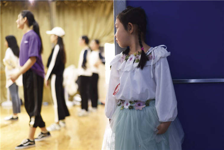 如您已购买,请登录参加练习生选拔的小女孩从舞蹈室门口经过时,被女团“TGK101”成员们的舞蹈所吸引(丁刚摄/视觉中国供图)