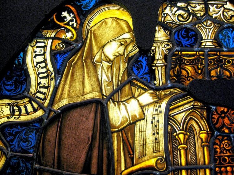 在小说《第五屠宰场》的开篇,库尔特·冯内古特描写了1945年盟军针对德累斯顿的大轰炸。小说主人公、美国士兵比利·皮尔格里姆在轰炸后“困于时空”,记忆在战时的德累斯顿、战后的美国和特拉法马多尔人的星球之间穿梭。影片配乐是格伦·古尔德演奏的巴赫——《哥德堡变奏曲》《f小调第5键盘协奏曲》《D大调第3键盘协奏曲》。《哥德堡变奏曲》主题与变奏之间的对话与对比,正如一个生命在不同时空的遭遇。而协奏曲中键盘被乐队裹挟的感觉,像极了个体被历史事件中淹没的命运。在德累斯顿大轰炸中,一百五十多件艺术品不翼而飞。其中包括12世纪德国圣人、修道院院长和作曲家宾根的希德嘉(Hildegard von Bingen)《认识主道》(Scivias)一书的《鲁伯斯堡抄本》(Rupertsberg Codex)。希德嘉生前和身后的奇遇,与小说中的比利并无不同。她同样被“困于时空”,在12世纪的德国、19世纪的法国和20世纪70年代后的英语国家这三个时空中徘徊。