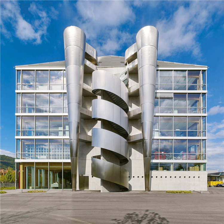 欧米茄工厂背面的螺旋形金属楼梯,两个金属锥体暗示制表工使用的工具