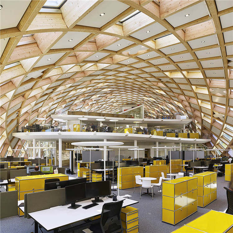 这也是从未有过的木构建筑,一个网格形状的庞大木壳既是屋顶,又构成大部分外立面,以它的弧形轮廓消除了传统办公楼的方盒子形态。由7700块工程木片构成的双曲面木壳拱顶,沿着两侧的街道河流蜿蜒穿行,延伸到240米长的总长度和35米的宽度。如果从空中俯瞰,它极像是默然盘踞在那里的一条巨蛇,“鳞片”在阳光下闪闪发光。