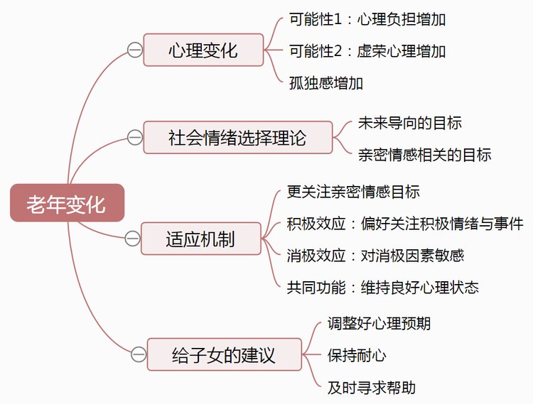 好了,这节课就讲到这里。围绕老年人的心理变化,我们首先讲了3个特点,第一点,是随着身体机能减退,老年人会变得自卑、心理负担加重;第二个是另外一部分老年人会往另一个极端——变得虚荣、固执、多疑;第三点,是老年人普遍孤独感变强,并且持续的孤独感会导致思维迟钝,加速衰老。其次,我们对比了东西方的老年人研究,发现不管是积极效应还是消极效应,其心理功能都是帮助老人更好地适应生活。最后,我们对于老人家的主要照顾者,提出了三点建议,调整好心理预期、保持耐心,以及必要的时候寻求外界帮助。