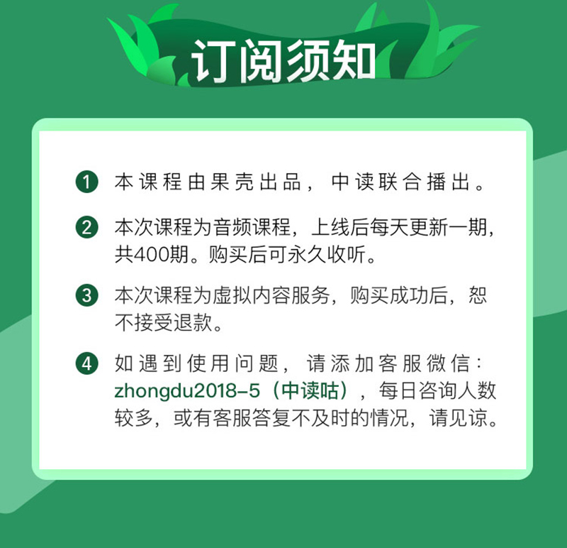 2.本次课程为音频课程,上线后每天更新一期,共400期。购买后可永久收听。