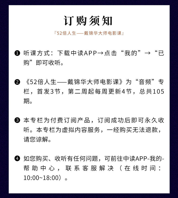 3.本专栏为付费订阅产品,订阅成功后即可永久收听。本专栏为虚拟内容服务,一经购买无法退款,请您谅解。