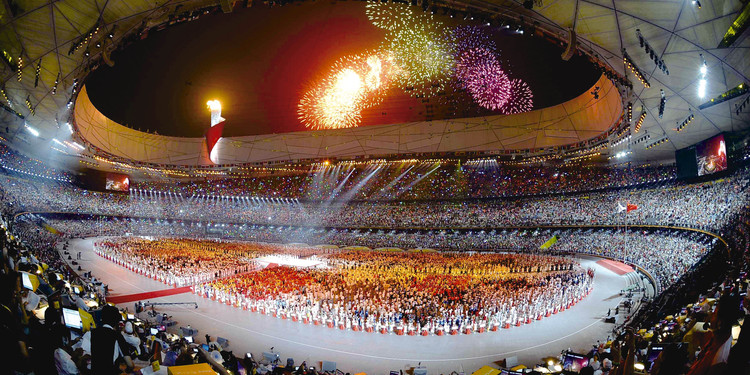 赫尔佐格和德梅隆终于等到了属于他们的大日子——绚烂烟火绕体育场一周,他们设计的“鸟巢”在奥运会开幕式...